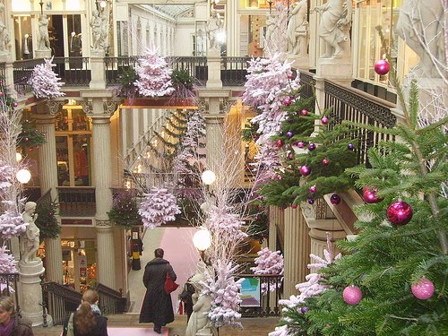 Strings of little white fairy lights twinkling like a million stars over our heads, swags of gaily-colored bulbs dancing in the darkness, our hearts burst to overflowing with the joy of the season. Silly Santas crawling up the sides of buildings and warm, fuzzy snowmen grinning at us with their impossible charcoal grins, inviting us inside innumerable cozy shops filled with red and gold and green and everything we don’t need but so want! Candy shop windows, “les vitrines des confiseries”, elegantly decorated, display boxes of chocolates tied up in gold ribbon, crystal dishes cradling jewel-like bonbons in every color, the romance of Christmas wrapped in tissue paper and dusted with icing sugar. The dream of snow floating down outside the apartment windows is the most exciting thing for this Florida girl, a Florida girl still after all of these years. Snow still excites me like a child on Christmas morning stepping gingerly down the stairs, peeking nervously around the corner to spy the tree and seeing that Santa did indeed, really bring brightly wrapped gifts and place them under the sparkling fir. Holiday music, not so much “Silent Night” or “Little Drummer Boy” as “Christmas Wrapping”, “I Saw Mommy Kissing Santa” or “Santa Claus is Coming to Town” piped in all over town, in stores and on the street, like having a joyous, sing-along-able personal soundtrack to my life.