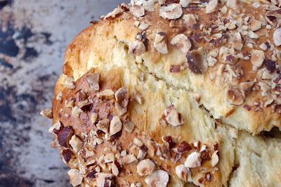 Preheat the oven to 350°F (180°C). Brush the top of the loaf with the egg wash and sprinkle on more coarsely chopped hazelnuts.
